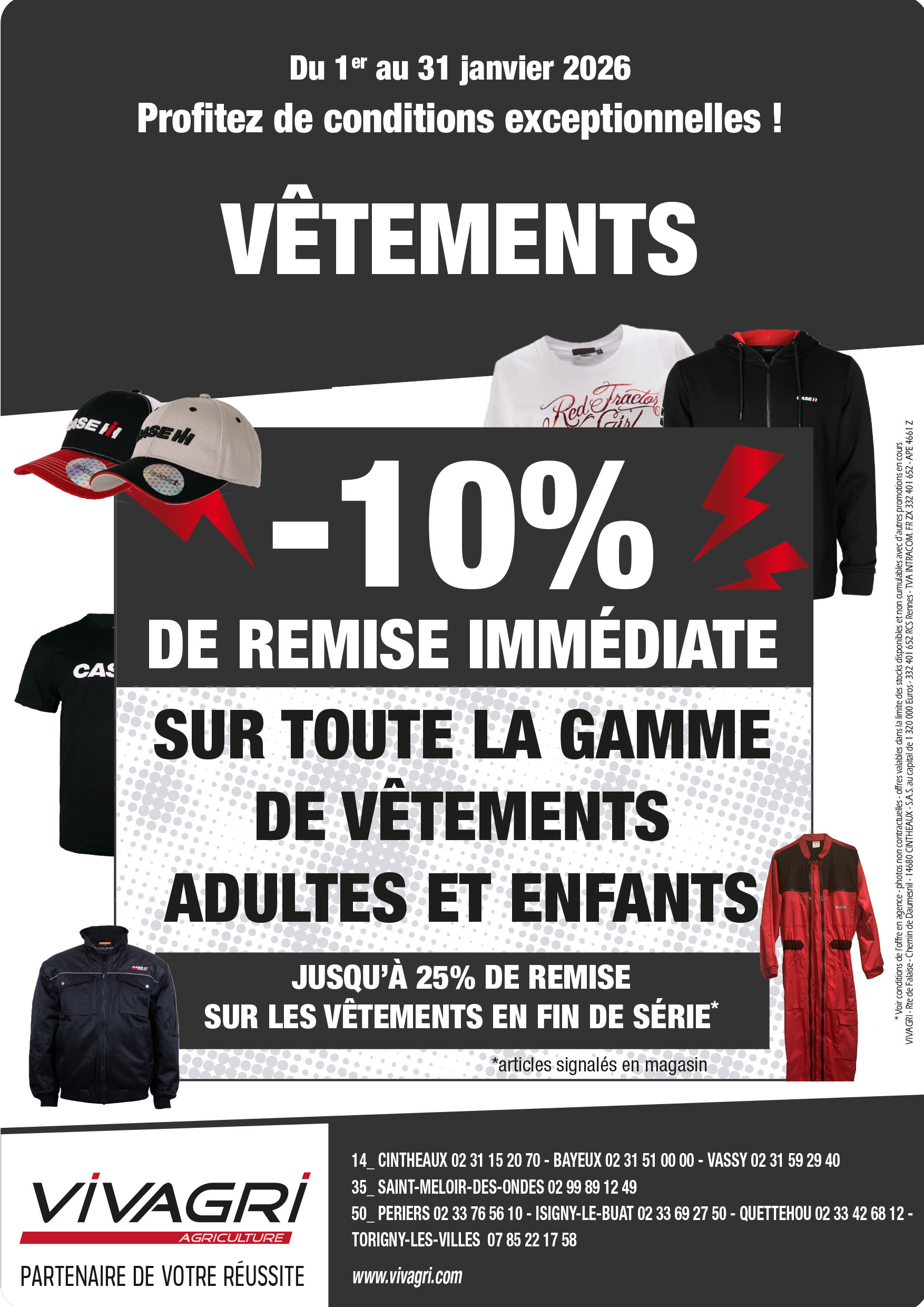 C'est le moment de vous rendre dans votre agence Vivagri la plus proche et de profiter de nos conditions exceptionnelles sur notre gamme de vêtements. Vous y trouverez le vêtement idéal pour le travail et les loisirs.