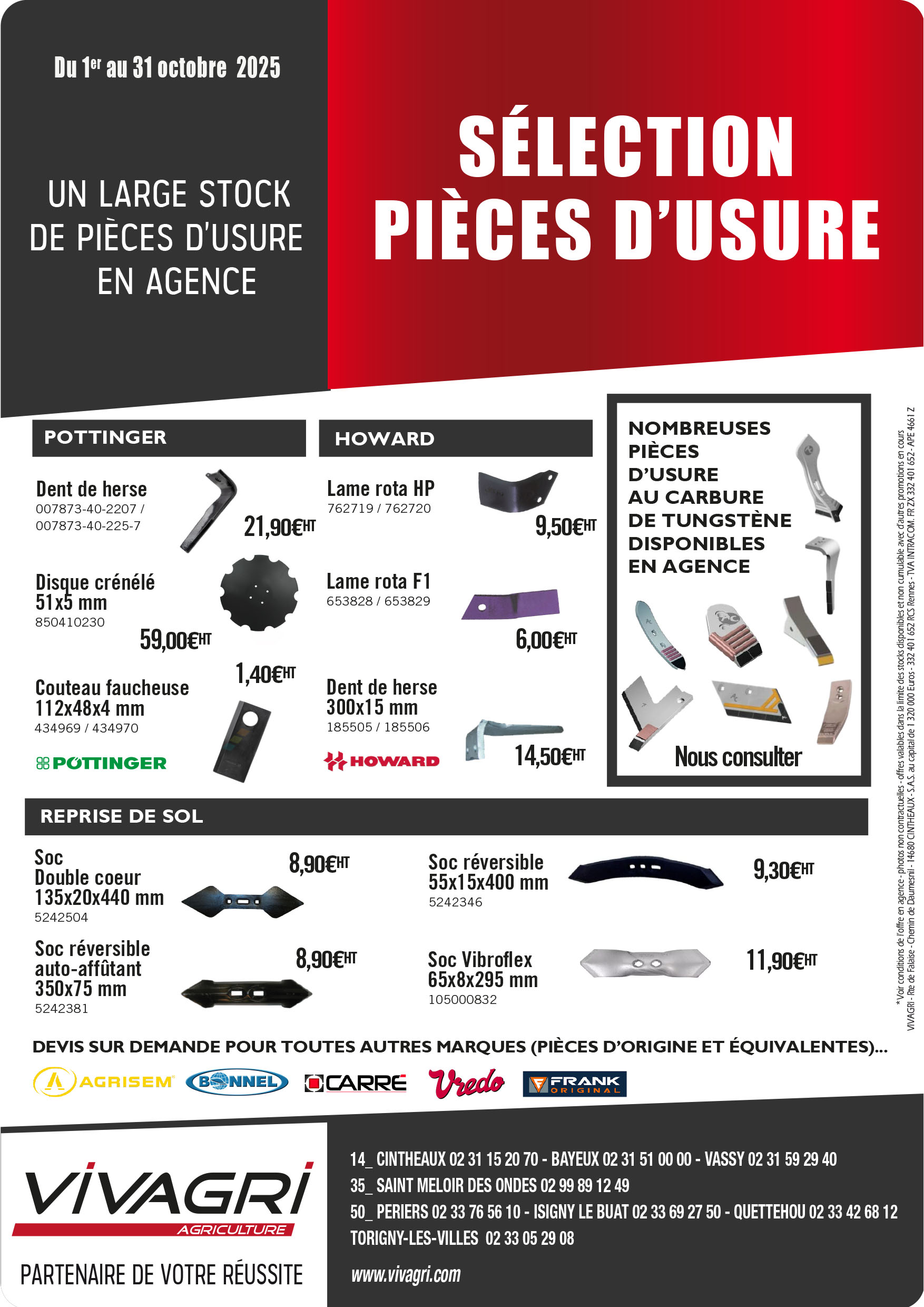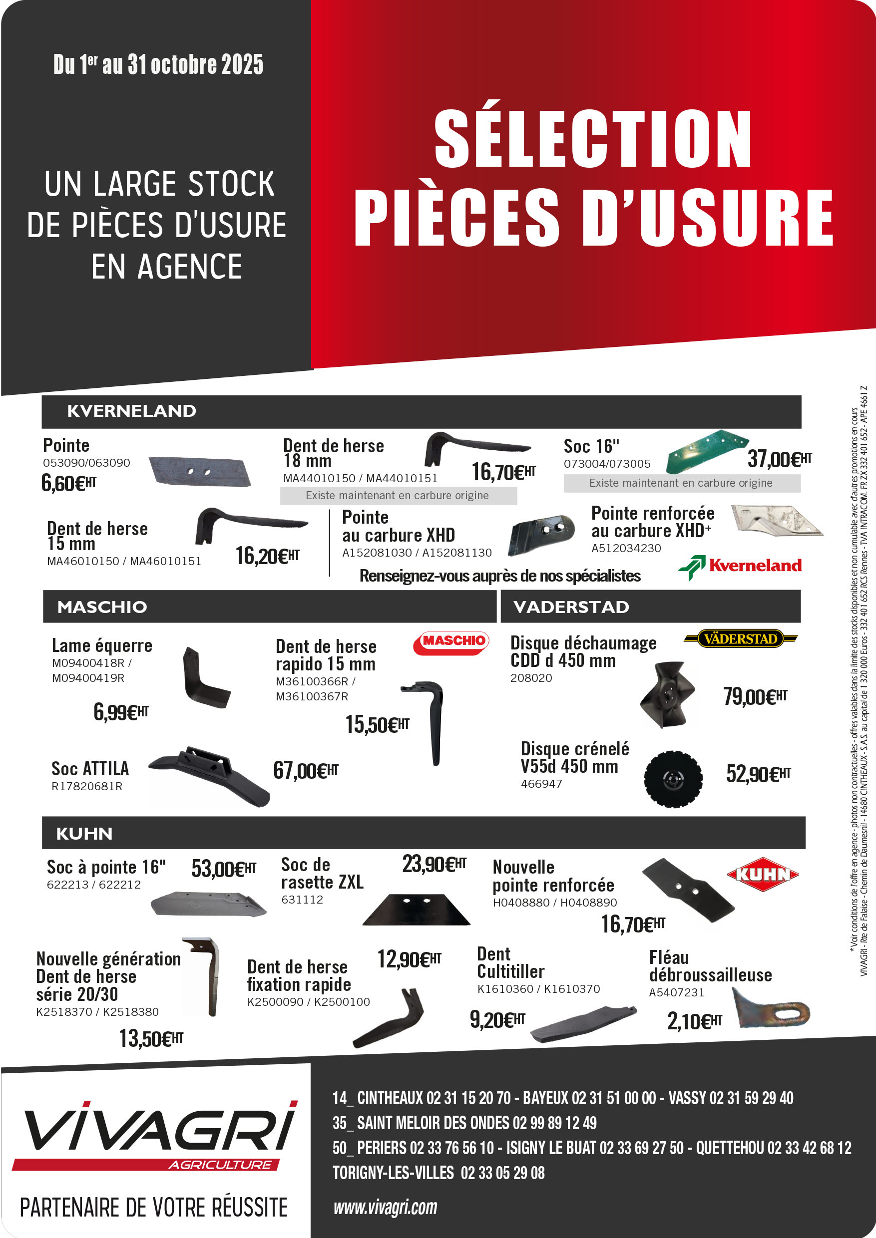 C'est le moment de vous rendre dans votre agence Vivagri la plus proche et de profiter de nos conditions sur les pièces d'usure (large stock en agence).