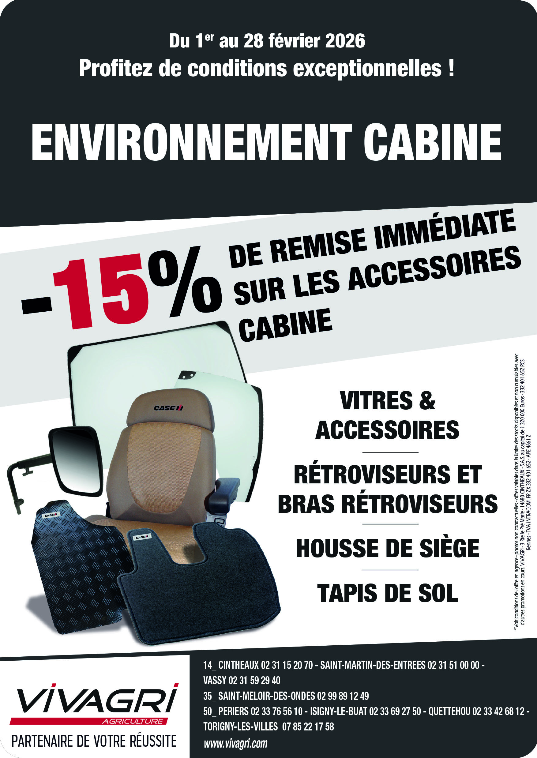 OPÉRATION ENVIRONNEMENT CABINE : C'est le moment de vous rendre dans votre agence Vivagri la plus proche et de bénéficier de 15% de remise sur les accessoires cabine.